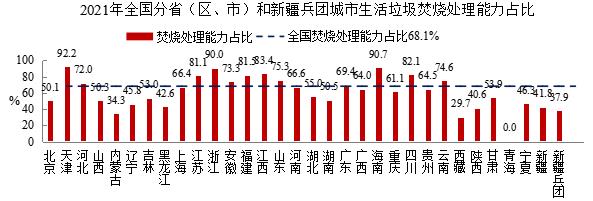 天津、海南、浙江、江西、四川、福建、江蘇、山東、雲南、安徽、河北、廣東、河南、上海、貴州、廣西和重慶17個省(區、市)城市生活垃圾焚燒處理能力占比超過60%;湖北、甘肅、吉林、湖南、山西、北京、寧夏、遼寧、黑龍江、新疆和陝西11個省(區、市)在40%-60%之間;內蒙古、西藏、青海3個省(區)和新疆兵團不足40%。