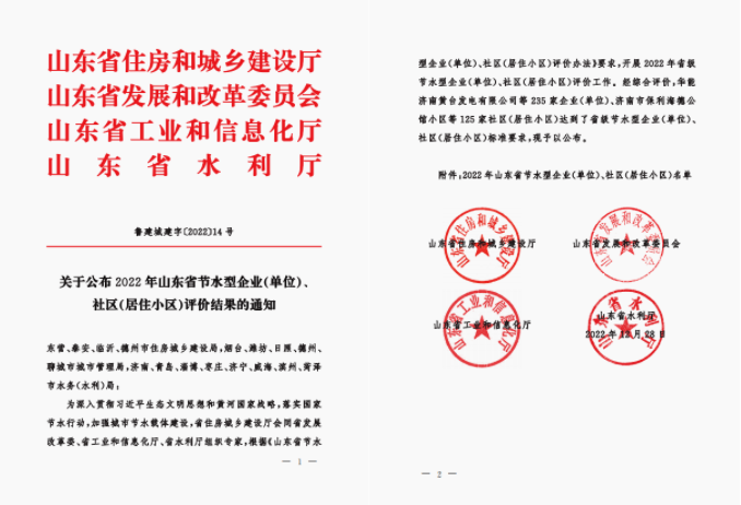 12月28日,山東省住房和城鄉建設廳、山東省發展和改革委員會、山東省工業和信息化廳、山東省水利廳聯合發布《關於公布2022年山東省節水型企業(單位)、社區(居住小區)評價結果的通知》,鄆城聖元獲評2022年省級節水型企業(單位)。
