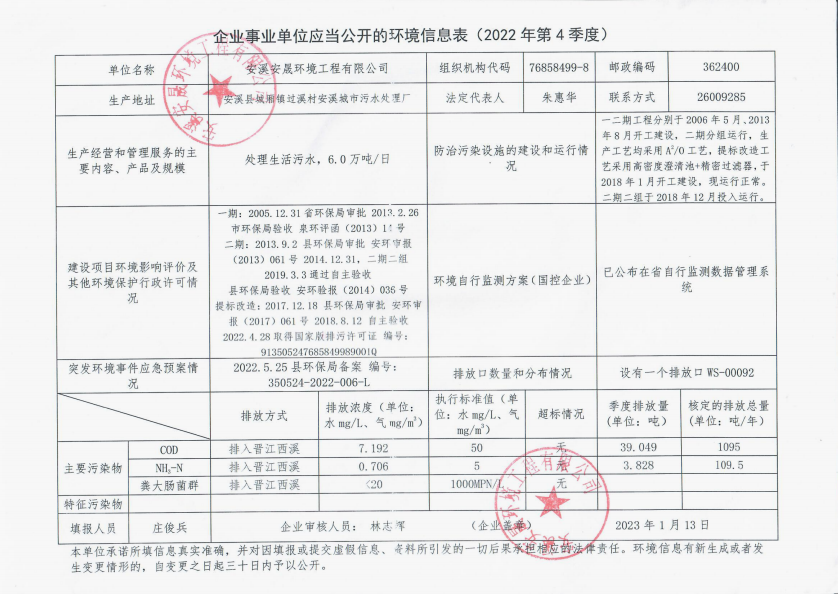 安溪城市汙水處理廠2022年第4季度環境信息公開