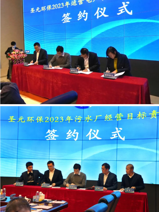 會上舉行了2023年度經營目標責任書簽約儀式。朱恒冰總經理分別與運營電廠、汙水處理廠運營班子簽署目標責任書。2023年各項目團隊必將齊心合力,以目標為導向,確保完成年度各項任務指標。