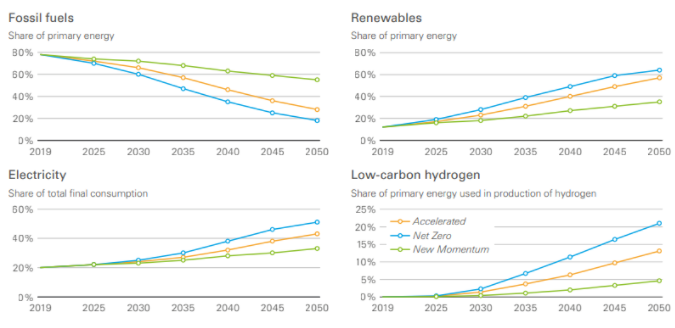 報告假設了加速轉型、淨零和新動力三種情景下到2050年能源係統的演變趨勢。報告提出,在加速轉型情景下,碳排放將減少約75%;在淨零情景下,碳排放將減少超過95;新動力情景(假設過去5年世界能源發展總體情況包括技術進步、成本下降等以及全球各國政策力度在未來5-30年不變)下,全球碳排放將在21世紀20年代達峰,到2050年全球碳排放相較2019年降低30%左右。