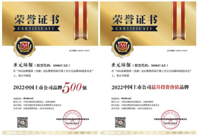 2月25日,由專業品牌評價機構Asiabrand集團發起主辦,中國亞洲經濟發展協會和亞洲品牌網聯合主辦的2022品牌強國(龍城)論壇暨第四屆中國上市公司品牌500強發布會在山西太原隆重舉行。聖元環保繼2021年度後再度攬獲2022年度“中國上市公司品牌500強”和“中國上市公司最具投資價值品牌”兩項榮譽。