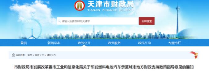 近期,天津市財政局發布了、發改委和工信局三部門聯合印發了《燃料電池汽車示範城市地方財政支持政策指導意見》。