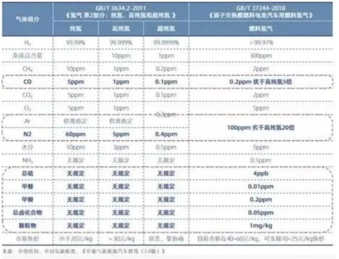 質子交換膜燃料電池用氫氣的純度要求低於工業用純氫、高純氫、超純氫的純度要求,但其對雜質含量的要求遠比工業用高純氫、超純氫的更為嚴格,不僅對常規烴類、CO、CO2、N2、Ar、水蒸氣等雜質含量進行了限定,而且對總硫、總鹵化物、甲醛、甲酸、氨等雜質的含量也進行了嚴格限定。