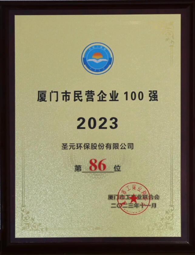 日前,2023年廈門企業家日大會召開,會上發布了2023廈門市民營企業100強榜單及係列子榜單,聖元環保再度上榜2023廈門市民營企業100強,位列榜單第86位。