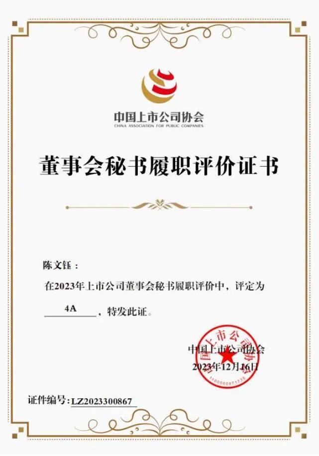 (三)聖元環保陳文鈺先生獲2023上市公司董事會秘書履職評價4A評級