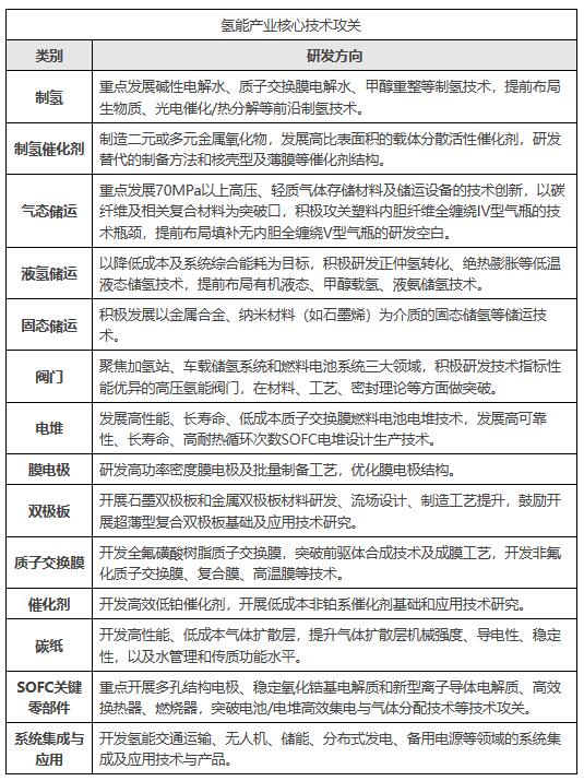 1.加jia快kuai核he心xin關guan鍵jian技ji術shu研yan發fa。以yi產chan業ye化hua為wei導dao向xiang,推tui動dong核he心xin技ji術shu的de關guan鍵jian性xing能neng提ti升sheng與yu綜zong合he成cheng本ben降jiang低di,實shi現xian核he心xin技ji術shu與yu產chan品pin的de自zi主zhu可ke控kong。鼓gu勵li創chuang新xin多duo元yuan化hua製zhi氫qing工gong藝yi方fang式shi,重zhong點dian發fa展zhan高gao效xiao率lv、長壽命、低成本的質子交換膜電解水、甲醇重整等製氫技術,提前布局生物質、光電催化/熱分解等前沿製氫技術。重點發展70MPa以上高壓、輕質氣體存儲材料及儲運設備的技術創新,提前布局以液態化合物為介質的液態儲氫和以合金、納米材料為介質的固態儲氫等儲運技術。重點開展高性能和低成本的質子交換膜、膜電極、碳紙、催化劑等燃料電池關鍵材料和核心零部件的技術創新,實現燃料電池係統關鍵性能指標達到國內領先水平,綜合成本顯著降低。