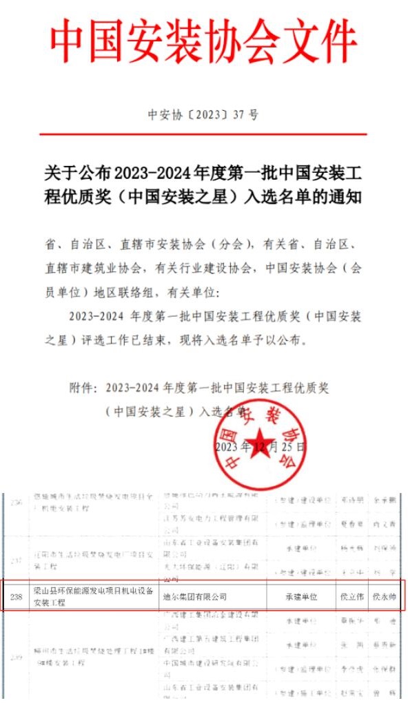 2023年12月25日,中國安裝協會正式公布2023-2024年度第一批中國安裝工程優質獎(中國安裝之星)入選名單,迪爾集團承建的梁山縣環保能源發電項目成功入圍,成為2023-2024年度首批“中國安裝之星”。