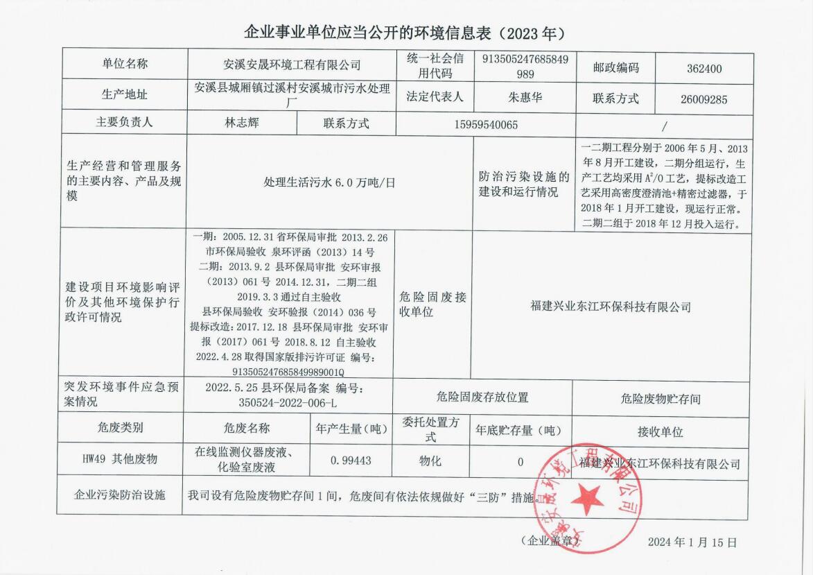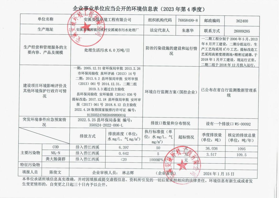 安溪城市汙水處理廠2023年第4季度環境信息公開