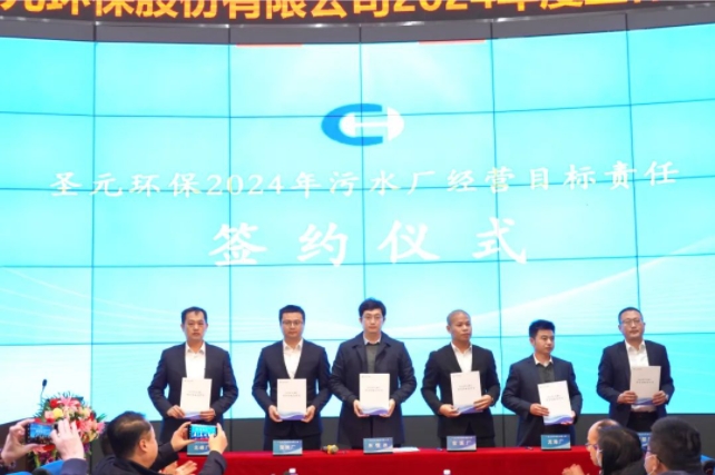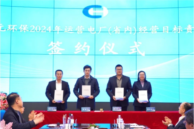 會上舉行了2024年度經營目標責任書簽約儀式。朱恒冰總經理與運營電廠、汙水處理廠經營班子分別簽署2024年經營目標責任書,將有效激勵和引導各項目團隊全麵抓好經營管理任務落實,強化履職擔當,全麵完成目標計劃。