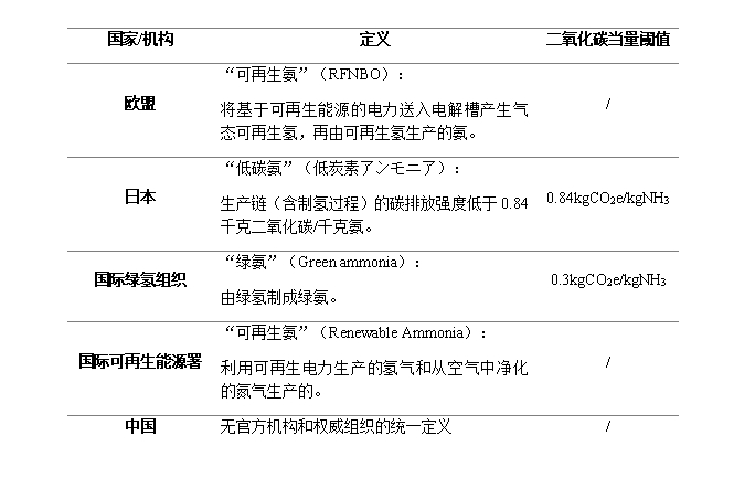 目前,國內關於“綠氨”尚shang無wu官guan方fang機ji構gou和he權quan威wei組zu織zhi的de統tong一yi定ding義yi。行xing業ye內nei具ju備bei相xiang關guan發fa聲sheng,國guo內nei企qi業ye對dui綠lv氨an的de定ding義yi主zhu要yao關guan注zhu其qi原yuan料liao氫qing是shi否fou由you可ke再zai生sheng能neng源yuan電dian力li製zhi取qu,對dui生sheng產chan過guo程cheng中zhong的de碳tan排pai沒mei有you明ming確que的de要yao求qiu。