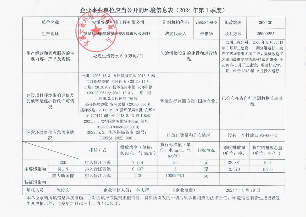 安溪城市汙水處理廠2024年第1季度環境信息公開