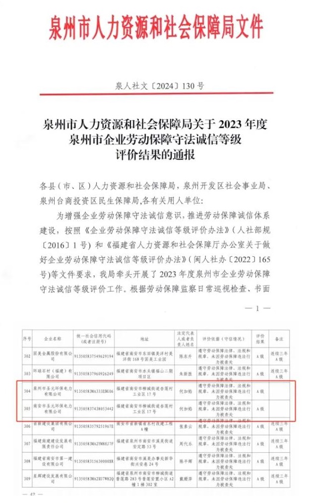 7月10日,泉州市人力資源和社會保障局印發關於2023 年度泉州市企業勞動保障守法誠信等級評價結果的通報,南安聖元和泉州聖元榮獲“勞動保障守法誠信A級企業”稱號。