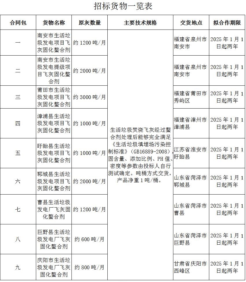 聖元環保股份有限公司對南安市生活垃圾焚燒發電廠、南安市生活垃圾焚燒發電廠提級項目、莆田市生活垃圾焚燒發電廠、漳浦縣生活垃圾焚燒發電廠、盱眙縣生活垃圾焚燒發電廠、鄆城縣生活垃圾焚燒發電廠、曹縣生活垃圾焚燒發電廠、巨野縣生活垃圾焚燒發電廠、慶qing陽yang市shi生sheng活huo垃la圾ji焚fen燒shao發fa電dian廠chang飛fei灰hui固gu化hua螯ao合he劑ji采cai購gou項xiang目mu的de下xia述shu貨huo物wu及ji服fu務wu進jin行xing國guo內nei公gong開kai招zhao標biao,現xian歡huan迎ying國guo內nei合he格ge的de投tou標biao人ren前qian來lai提ti交jiao密mi封feng的de投tou標biao。