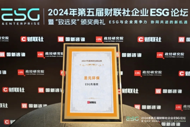 11月29日,2024年第五屆財聯社企業ESG論壇在北京舉行。聖元環保股份有限公司(簡稱“聖元環保”,股票代碼:300867.SZ)獲評2024年度財聯社致遠獎·ESG先鋒獎。