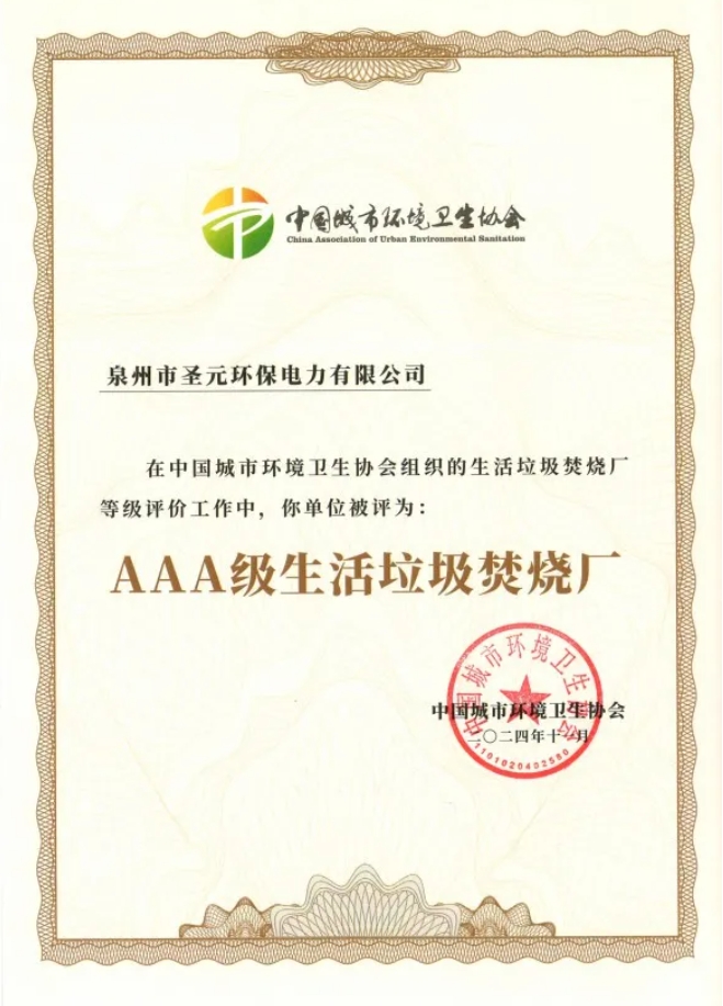 日前,泉州市聖元環保電力有限公司順利通過中國城市環境衛生協會組織的生活垃圾焚燒廠無害化等級評定,獲評國家AAA級生活垃圾焚燒廠。AAA級代表全國生活垃圾處理設施無害化最高等級,標誌著泉州聖元生活垃圾無害化處理已達到國內領先水平。