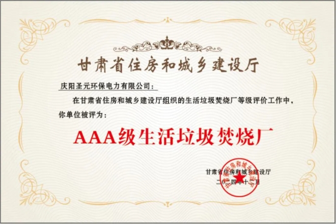 近日,慶陽聖元順利通過甘肅省住房和城鄉建設廳組織的全省生活垃圾焚燒廠等級評價,獲評甘肅省AAA級生活垃圾焚燒廠。