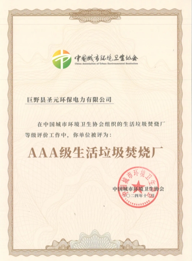 此次獲評AAA級生活垃圾焚燒廠是對巨野聖元過往工作的高度認可。公司將始終致力於推動城市生活垃圾減量化、無害化、資源化處置,積極貢獻於地方綠色低碳高質量發展,助力實現國家生態文明建設和“雙碳”戰略目標。