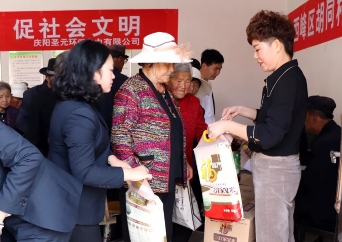 慶陽聖元總經理葉紅俠在活動開始前發表了熱情洋溢的講話,向胡同村的老年人送去節日問候和衷心祝福,對他們一生含辛茹苦為家人、為集體奉獻一輩子的精神表示敬佩。葉紅俠總經理說,慶陽聖元作為市重點企業,一直遵照總部“奉獻社會、造福一方”的理念,從成立至今,逢年過節,組織員工看望當地民眾,衷心祝願老人家每天健健康康、笑口常開。