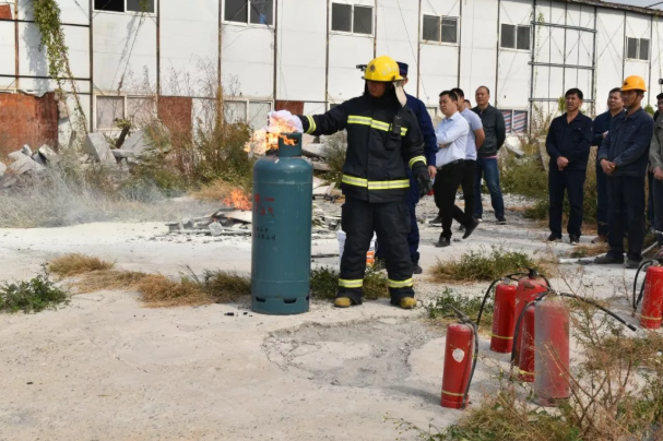 在室外演練場,東莊中隊指揮官就消防知識、日常各種火災的應對、滅火器的使用等進行講解。隨後,參訓員工使用滅火器進行滅火操作。